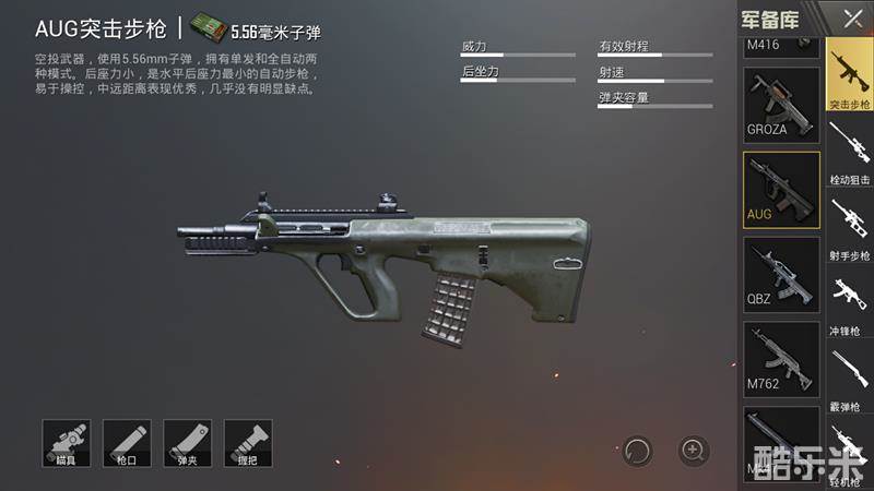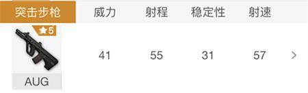 首先在游戏的军械库里,玩家们能够粗略的看到各个枪械的属性。在这个界面同时看AUG和M416这两把枪,仿佛除了射速的差距很明显之外,两把枪相差无几。这个时候就要运用到刺激战场助手了,在助手的资料库里面能够看到每把枪械的详细数据,如下图所示:
