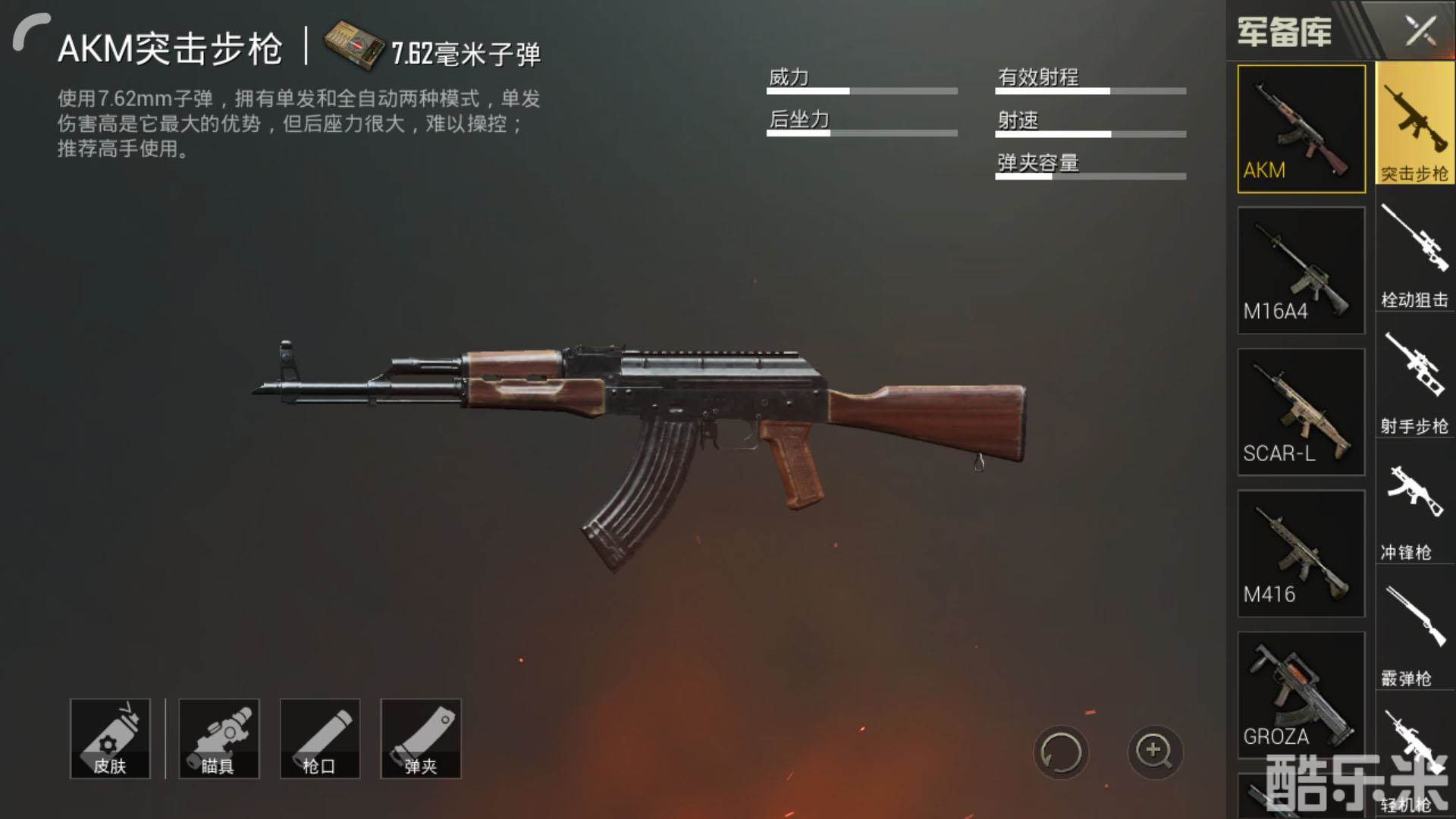 数据观察:步枪中的王者,曾经的7.62MM子弹步枪神器。从数据上观察AKM综合性能比较中等,输出能力较强,但是射速较慢,相对于5.56枪械来说有些劣势,只能通过练习压枪来改善枪械缺点。其最大的优点就是近战能力强,毕竟后坐力大,近战输出靠爆发。