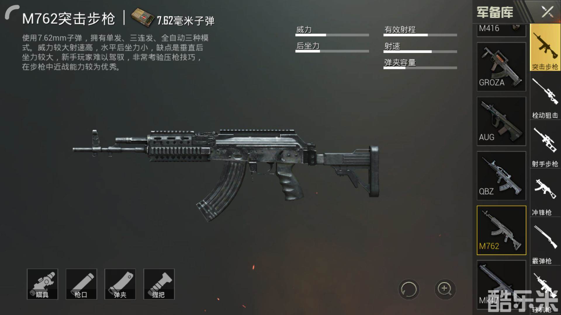 实际操作:M762这把步枪手感较好,落地刚枪手感不亚于5.56步枪,很多时候因为伤害较高被玩家使用,枪械声音打击感很强,比AKM带感,很多想接触7.62枪械玩家可以从M762开始。