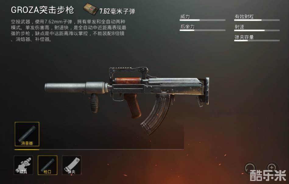 Groza突击步枪是一款使用7.62MM子弹的枪械,拥有单发和全自动两种射击模式。它继承了适配7.62MM子弹枪械的高伤害优点,同时极快的射速也使其成为近距离表现最为出色的一款突击步枪。同时,它的缺点也很明显,对于中远距离的目标射击时,比较难以掌控。