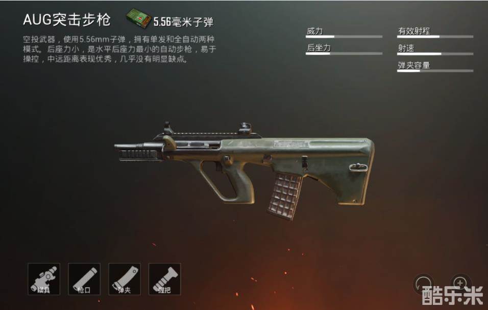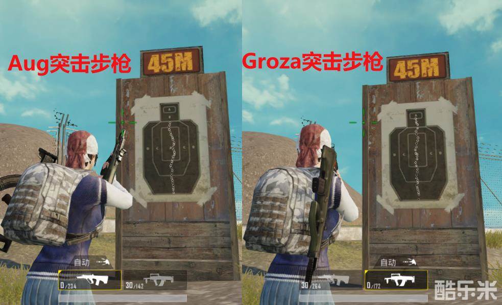 我们看出,Groza突击步枪的优势在于高伤害和高射速。但是,该枪对于配件要求的苛刻使其在满配件的情况下要劣于Aug突击步枪。所以,玩家在游戏实战中如果能够凑齐Aug突击步枪的全部最佳配件,那么Aug突击步枪会是一个不错的选择。