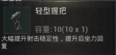 解析:大幅度提升射击稳定性让其子弹偏离准度幅度大大降低,也就是大大降低屏幕抖动程度,而提升后坐力回复,跟半截式握把一样加快准心的回复速度。仔细一看轻型握把的属性有些鸡肋,但是在没有握把的情况下,作为暂时的替代品还是不错的。
