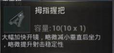 解析:最后一款握把,大幅加快开镜速度,略微减小垂直后坐力,略微提升射击稳定性。从属性介绍上来看,拇指握把的开镜速度比直角前握把更快,对于垂直方向后坐力的减小没有垂直握把优秀,在射击稳定性方面也略有提升,整体的综合属性十分不错。