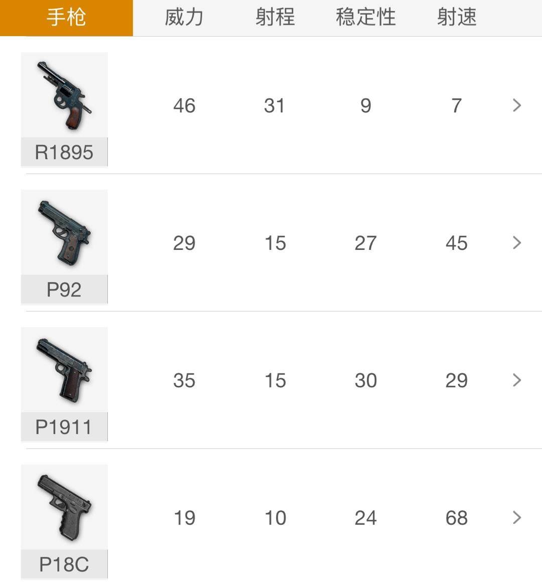 如上图所示,在海岛地图中,玩家一共能捡到四种手枪,分别是发射7.62mm子弹的R1895左轮手枪、发射.45口径的P1911以及发射9mm子弹的P92和P18C。大家可以看到这四把手枪的各种数据,其中发射7.62mm子弹的R1895伤害达到了46,这可是和步枪M762持平的伤害,但R1985的射速较慢,在近距离的时候常常只能开出两到三枪,所以尽量不要和敌人贴脸使用,特别是贴脸的时候很紧张,而枪法又不好的同学。但在中近距离的时候,这把左轮手枪成为了无数人的信仰,更是可以配合手枪消音器完成许多“骚操作”。P92和P1911是两把对比很明显的手枪,P92的弹夹是15发,P1911的弹夹是7发,但P1911的伤害大于P92,这就很好让玩家区分和选择。