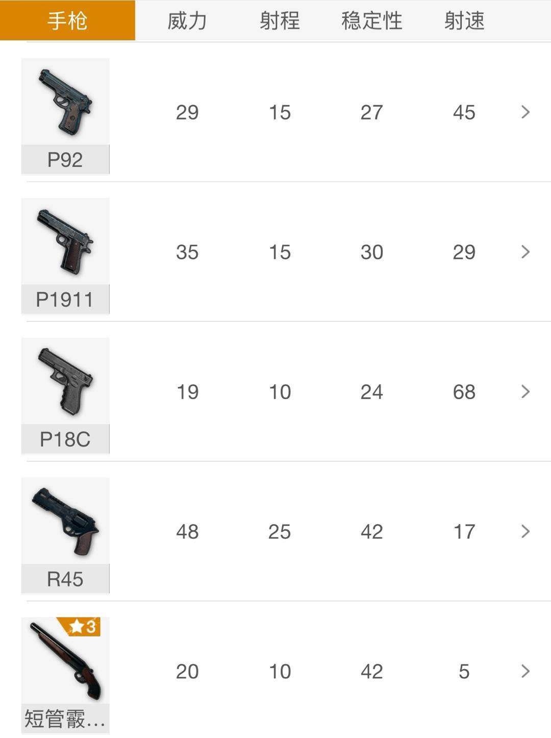 由于在沙漠地图中移除了R1895,所以官方做了一把发射.45口径弹药的R45左轮手枪来代替R1895的位置,可以看到两把枪的伤害是一模一样的,而其他的则是各有千秋,玩家可以自行体验手感,在用法上和R1895差不多,在中距离的时候用来点人较好,而贴脸使用需要十分冷静和过硬的枪法。那么沙漠地图中最特殊的无异于就是短管霰弹枪,这是游戏中唯一一把发射12口径子弹的手枪,而且是连发,类似于S686,可以以极快的速度连续发射两次,也只能装两颗子弹。由于是使用12口径子弹的霰弹枪,这就限制了短管霰弹枪只能在近距离贴脸使用,而敌人常常想不到这一手,所以很容易卡一个视野让敌人以为你在打药,诱使敌人突脸,这时掏出短管霰弹枪一击入魂。在沙漠地图中,掩体较少,要么就是远距离的狙击战,要么就是房区的贴脸战,所以个人认为P18C可能不及短管霰弹枪有用,比较贴脸还是霰弹枪的致死率最高,而远距离两把枪都完全没用,所以在沙漠地图中个人还是推荐选择短管霰弹枪。