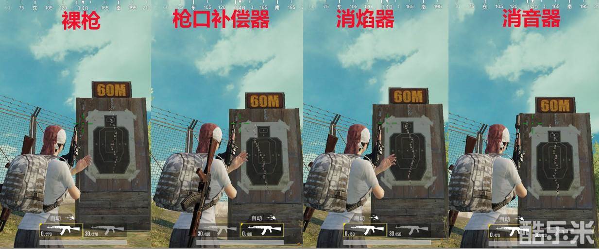 突击步枪是大部分玩家的主战武器,大体上可以依照子弹的口径简单划分为5.56MM口径和7.62MM口径两大系列的枪械。其中,使用7.62MM子弹的突击步枪以单发子弹高伤害和较强的后坐力为特点,以AKM枪械为其代表。接下来,我们就以AKM为典型,测试一下三大枪口配件对于弹道的影响。