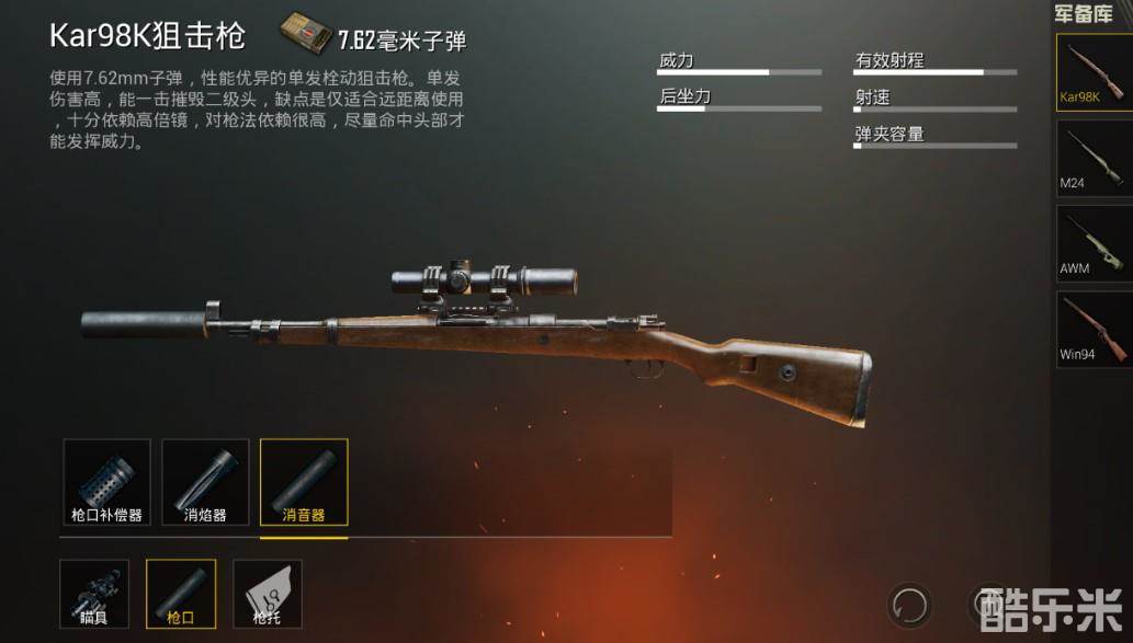 由于栓动狙击都是进行单发伤害,枪口的水平和垂直方向的后坐力较难有明显的体现,所以补偿器和消焰器带来的后坐力减少就显得意义不大。结合游戏的实际情况,栓动狙击是远距离狙杀敌人的主战武器,所以作为一名狙击手而言隐蔽自己是关键,进而栓动狙击的最优枪口配件选择是消音器>消焰器>枪口补偿器。