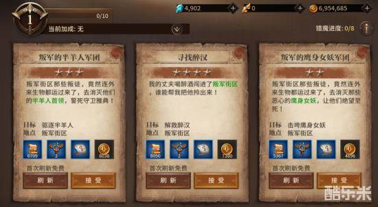 每天可以接取八个猎魔悬赏,完成后会获得大量的经验奖励和弑魔契约。猎魔悬赏有不同的星级,星级越高,对应的经验、金币奖励则越丰厚。悬赏任务可以被刷新,请合理使用。