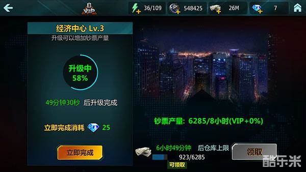 然后,钞票的另一个重要来源当然非基地产出不可了。基地的经济中心在达到一定的级别后所产出的钞票是十分可观的。如果在每次关闭游戏前能够领取一次产出,那么在你下一次打开游戏的时候能收获不菲的钞票数哦~~~