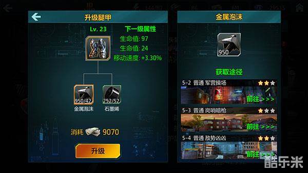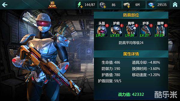 防具不单单是为主角带来狂拽炫酷吊炸天的外观,同时还可以为主角提供不同的属性哦,每件防具均可升级,防具等级不可超过主角等级,每项防具升级所带来的效果不同,可根据个人喜好做选择,例如喜欢风骚走位的可以选择优先强化腿甲,这样可以给你带来更高的移动速度,想去哪里就去哪里,喜欢快速换弹可以不停突突突射击的可以优先选择强化护手,提高换弹速度可以让你射击间歇变的更短,让你想射哪里射哪里,如果你要是喜欢站着撸那么强化头盔则是不二选择,头盔可以给你带来很高的护盾值,什么站着撸,躺着撸,横着撸,竖着撸统统不在话下。