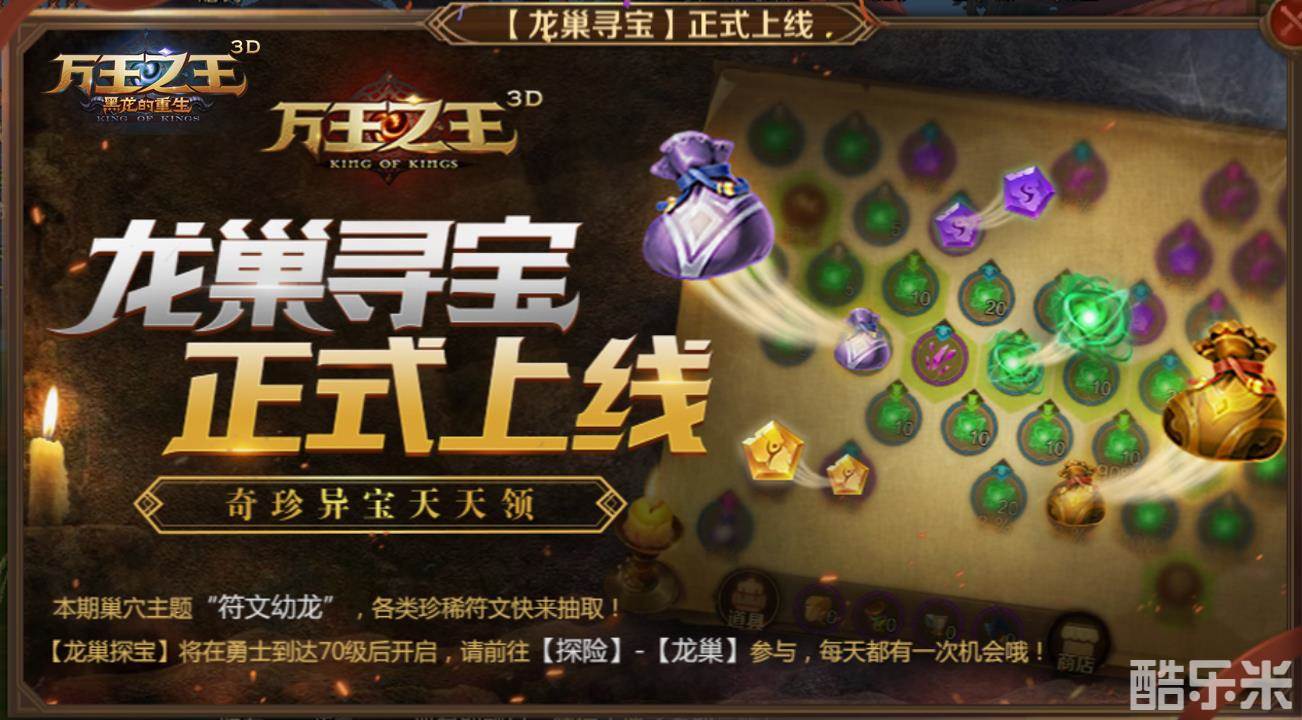 在全新的2.0版本《万王之王3D》手游中,符文幼龙巢穴现世,玩家可进入龙巢获取宝藏啦!此玩法对玩家的战斗实力没有太大要求,需要玩家开动脑筋走出龙巢才能获取所有奖励哦~下面小编就为大家带来龙巢寻宝玩法解析。