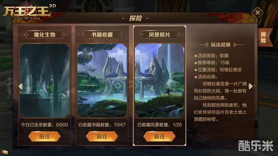 在《万王之王3D》手游中,风景存在于坦格拉美亚大陆的每一处,系统会提示勇士们风景的出现。风景收集是万王之王的特色玩法之一,收集各类风景可以为玩家带来大量的属性加成,那么风景在哪儿收集呢?今天小编就为大家分享万王之王风景收集攻略。