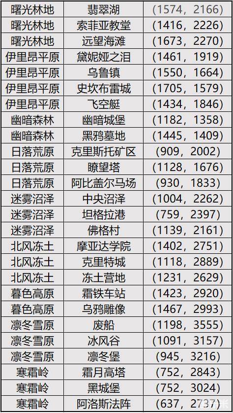 每个风景点都有着独特的属性,玩家找到指定地址后完成收集风景的任务就可解锁对应风景点,并获得对应风景点属性加成效果,可以提升人物属性效果。而在万王大陆风景分布地点是很广的,可以先确认地点再按照地图远近顺序收集,这样可以节约游戏时间,游戏内风景位置坐标如下表: