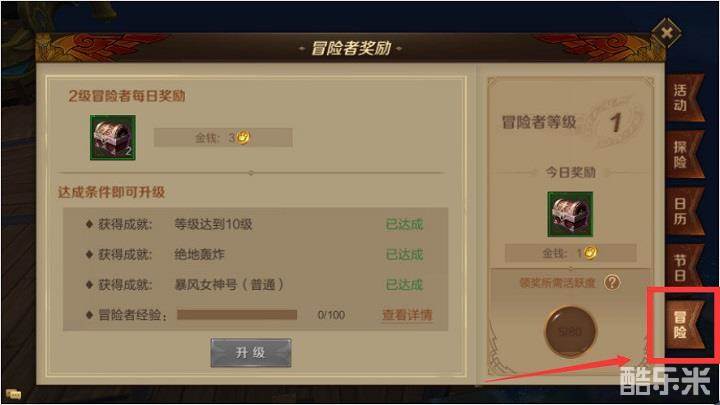 最初的冒险者等级为1级,各位勇士在达到领奖所需的活跃度后,可以领取“1金钱+随机获得5~1000钻石的冒险物资箱”。随着冒险者等级的提升,每日所获奖励的金钱数额与冒险物资箱数量也会逐步提升,届时各位勇士每天都能获得一笔稳定可观的财富。