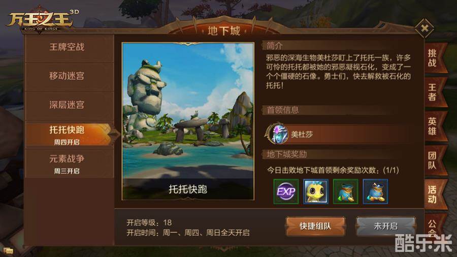 托托快跑为地下城活动,每周一、周四、周日全天开启。在此活动中,各位勇士击败地下城首领即有机会获取优秀品质、精良品质的华丽宝石袋与高贵宝石袋。