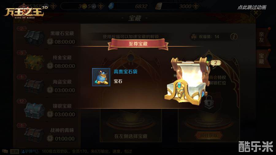 至尊宝藏、纯金宝藏、镶银宝藏、黑曜石宝藏都可以开出宝石袋,这些宝藏可以通过完成每日任务、佣兵派遣、商店购买等方式获得。但是由于开启宝藏需要的时间较长,所以小编还是建议大家开启奥罗商会特权获得额外解锁栏位,这样就可以快速获得宝石奖励了。