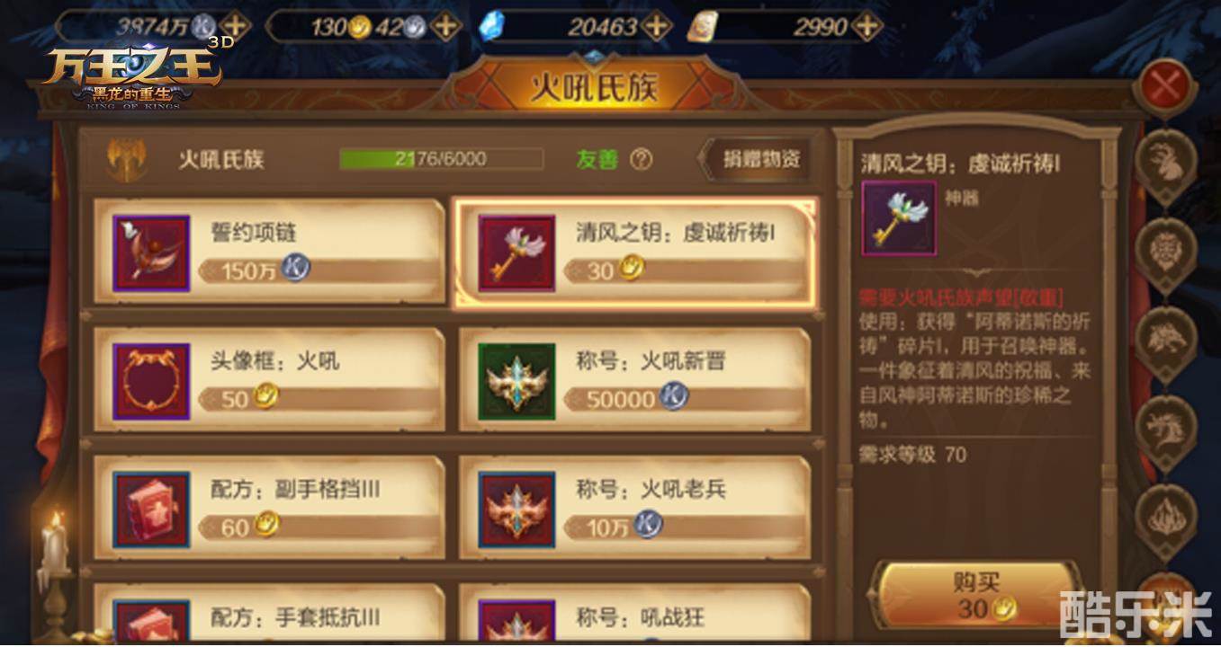 2. 清风之钥:虔诚祈祷Ⅰ,需要玩家在火吼氏族声望达到敬重,前往声望商店花费30金币即可购买;