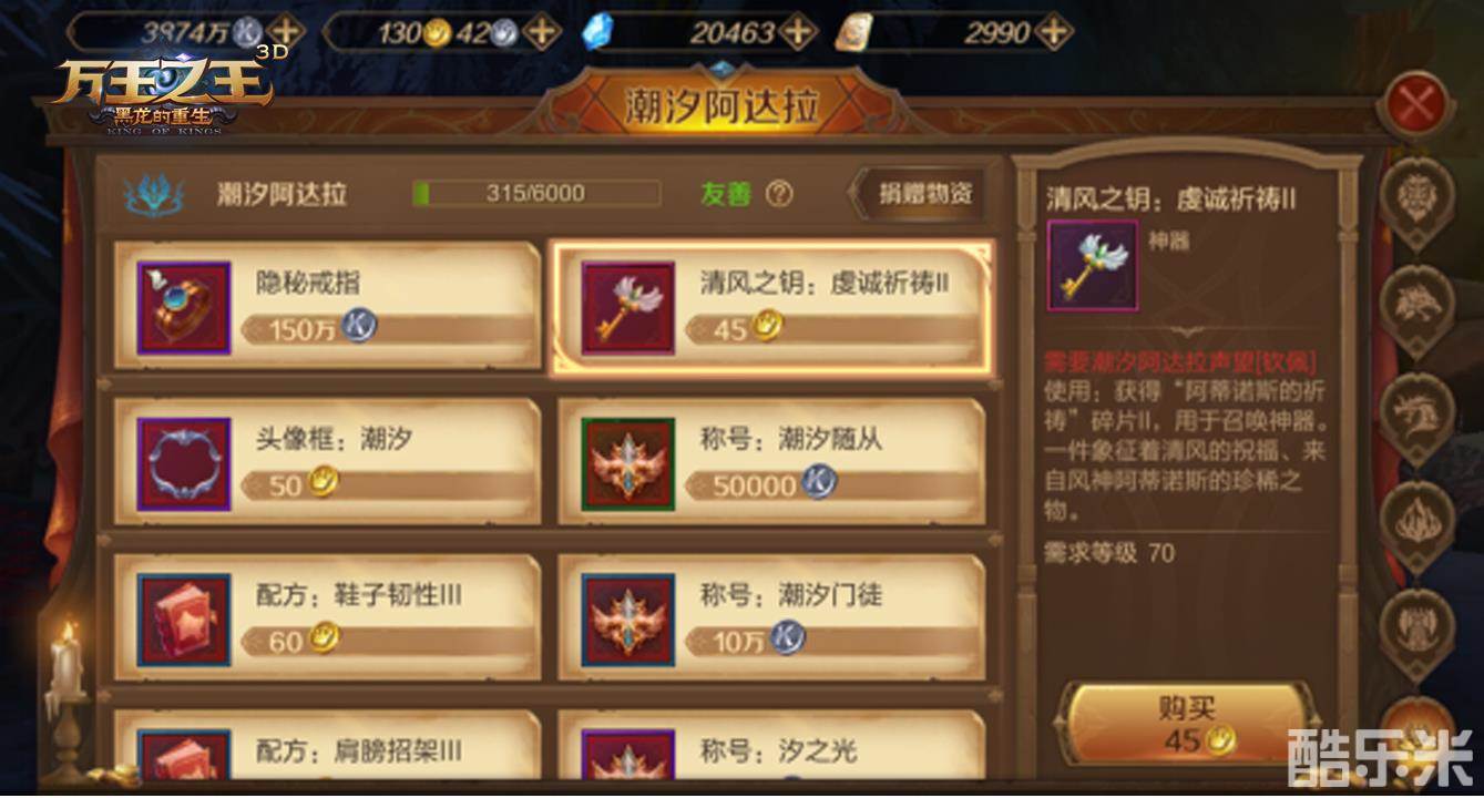 3. 清风之钥:虔诚祈祷Ⅱ,需要玩家在潮汐阿达拉声望达到钦佩,前往声望商店花费45金币购买;