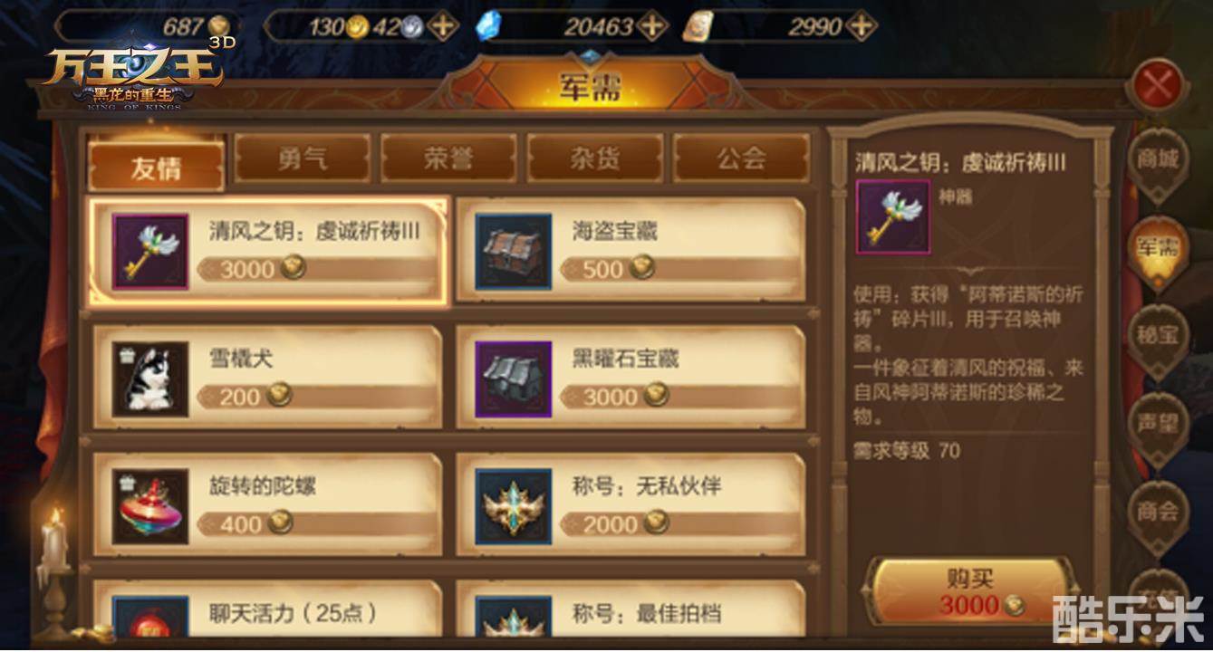 4.清风之钥:虔诚祈祷Ⅲ,前往军需商店友情页,花费3000友情币即可解锁神器碎片;