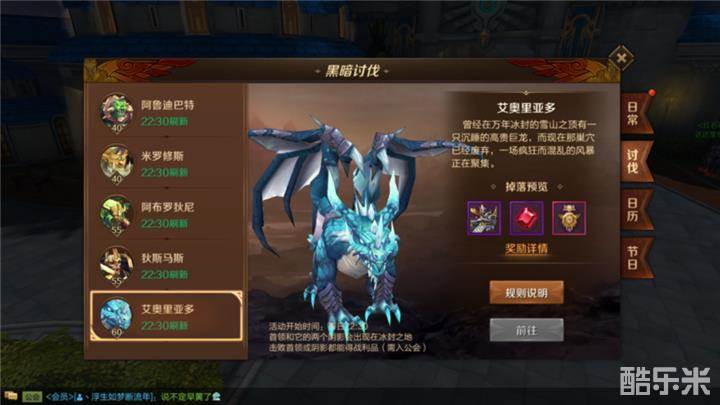 讨伐给大家推荐一套打法:先去冰龙打一个,摸其他两个伤害,打完跑迪斯马斯2,打到50%再去迪斯马斯3,再让坦克去吧迪斯马斯1拉过来一起打,达到前三就可以跑去米罗休斯和阿布罗狄尼摸伤害,但阿鲁迪巴特就不用去了,去了一般也被打完了,时间不够。其中冰龙是有可能出唯一宝石和坐骑的。