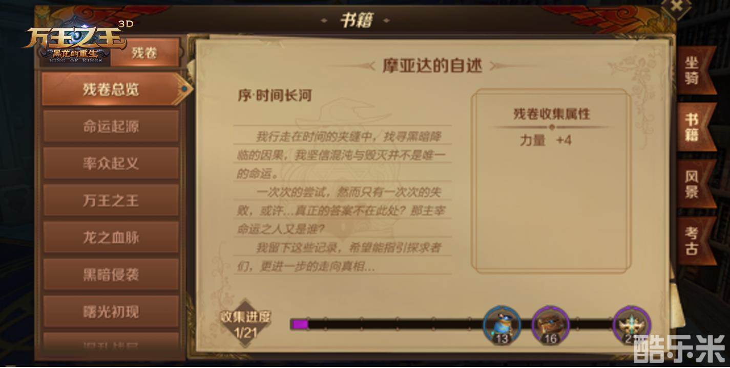 在《万王之王3D》手游中,收藏系统包含坐骑、书籍、风景、考古四大部分,小编要讲解的残卷收集属于书籍收集的一部分。成功收集残卷之后就能获得更多的属性加成,下面小编就为大家带来残卷收集攻略,让大家轻松获取所有残卷。