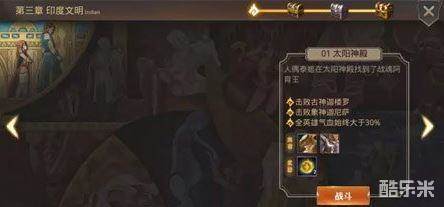 永恒文明印度文明太阳神殿怎么打,今天,大家就来一起看一看亚洲地区另一个古老的文明——印度文明的一些情况吧。在这场战役中,大家会遇到一个小BOSS,一个大BOSS,还需要保持30%以上的气血,这三点同时做到的难度不是很大,大家只需要多注意注意就好了。