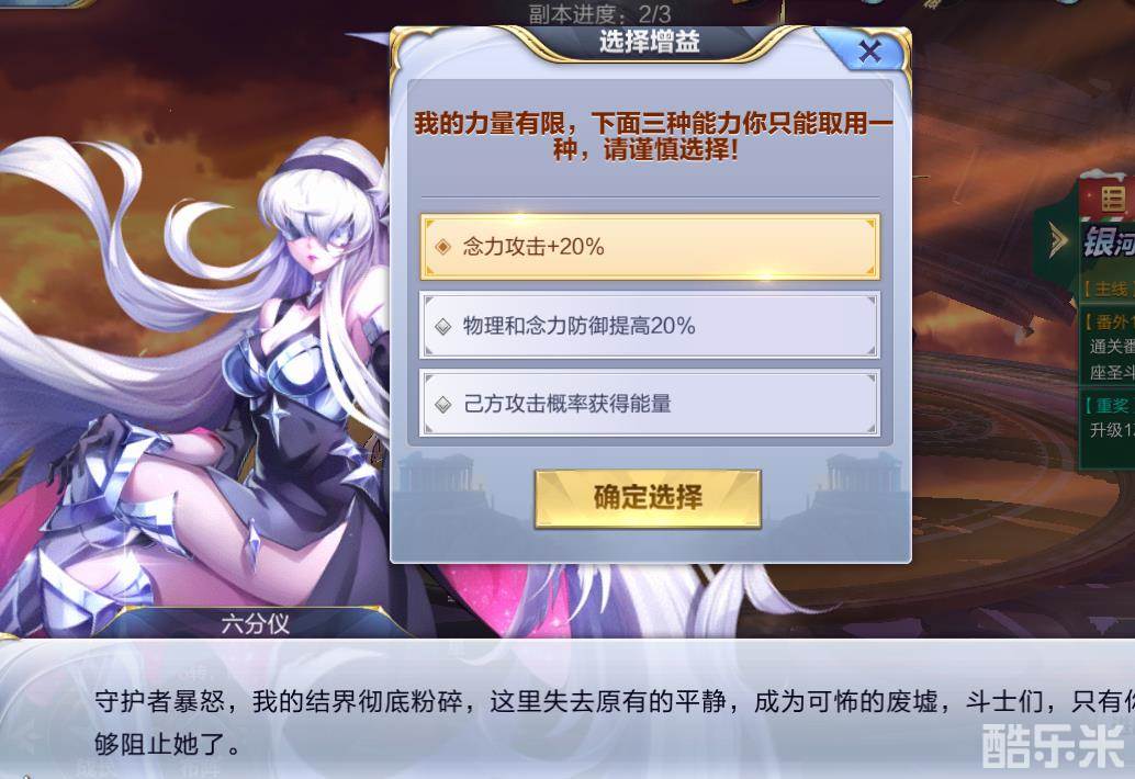 通关第一关之后会进入一个选择增益的环节,这个环节在通关第二关之后还会出现一次,一共可以在六个增益中选择两个来提升队伍实力,帮助大家更好地通关。
