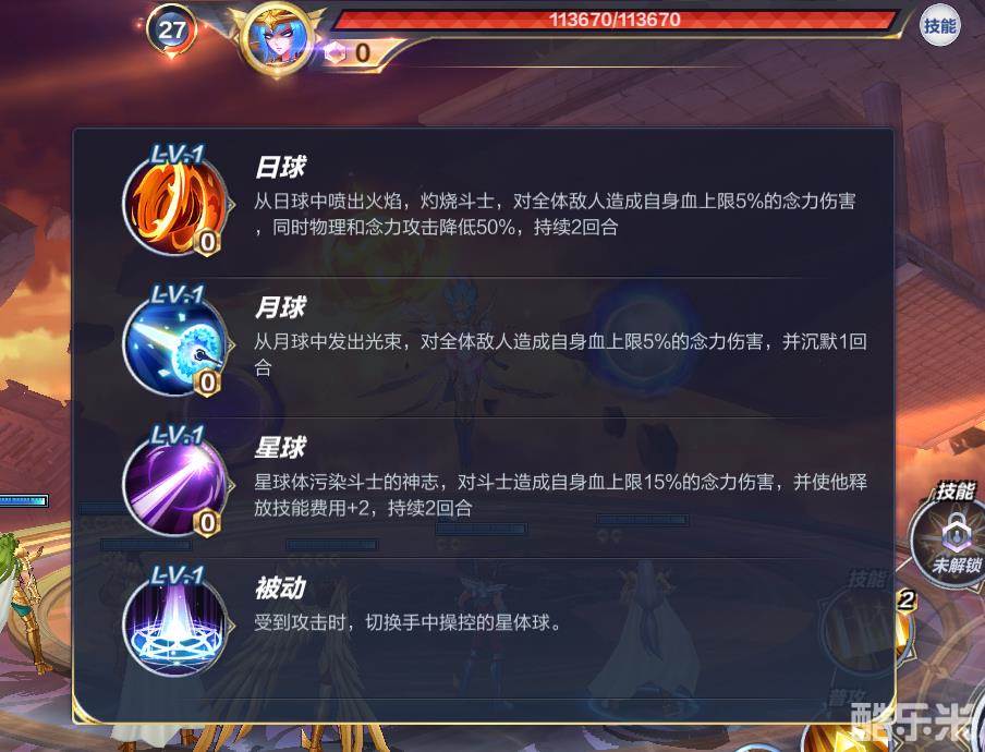本关boss需要大家规划好攻击次数,boss的三个球对应三个技能,每个技能有不同的特殊效果,大家可以根据自己的阵容去选择抗哪一种技能。其中日球带有降低攻击的效果,选择吃日球技能的话通关思路可以参考第一关;月球带有全体沉默的效果,选择吃月球技能的话需要携带有净化能力的斗士或者可以依靠普攻打输出的斗士;星球是伤害较高的单体攻击,同时带有消耗增加的减益效果,选择吃星球技能的话推荐上阵珍妮分摊伤害。