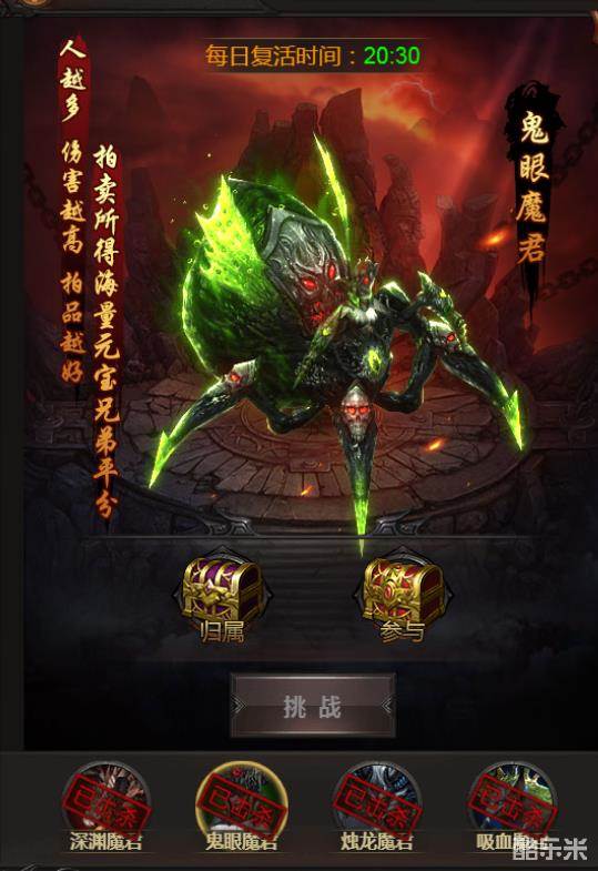 每日20:30魔界的4位魔君将会入侵玛法大陆,可选择击杀其中一位魔君(选择后不可改变)