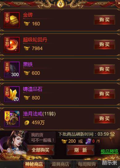 商城是游戏一个非常方便的系统,它能够提供各种装备、材料、道具等很多提升战力非常重要的直接购买方式。商城分为神秘商店,道具商店,每周限购。道具可以直接购买,而神秘商店不同的是刷出来的道具、装备等是有折扣的,所以看见便宜的好东西不要放过哦。而每周限购次数刷完之后,只能等下周重置次数才能购买。