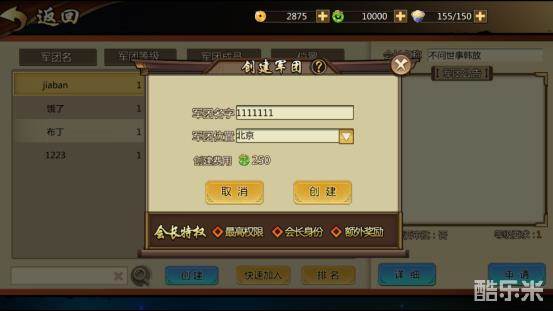 点击就会有一个创建军团的窗口,输入名字,选择军团位置,点击创建。只需要250灵玉我们就可以创建一个属于自己的军团啦。除了自己创建我们也可以选择加入其它军团哦。