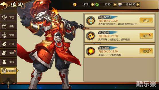 在这里我们可以看到有三个活动:军团BOSS、无尽修炼、金玉满堂。