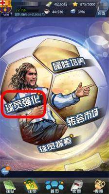 游戏主界面中,点击“球员”即可看到“球员强化”,点击“球员强化”进入。点击所要强化的球员,进入球员强化界面。