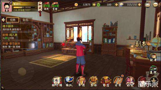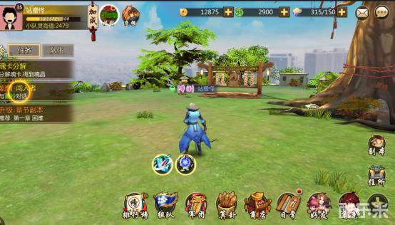 主界面功能大体可以分三部分,游戏界面上半部分主要是一些福利和变强的指引,包括角色头像、变强、邮件、聊天、任务和队伍等按钮。下半部分显示的是排行榜、组队、军团、算卦、商店、日常、好友、角色、副本、庭院和游戏的走路摇感等功能,在界面的背景部分则有副本、庭院、算卦、剧情等功能。