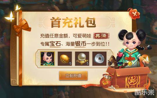 首次充值任意金额的元宝,获赠限定金色武将——萌娃典满(强力群攻法师)。累计充值10元,即可享受总价值2000元宝的两次免费五连抽机会。