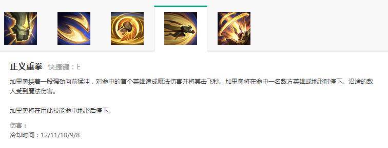 另外一点就是爆发伤害,加里奥的爆发极度依赖E技能的先手,如果不能顺利E技能撞起敌人,之后的W技能也很难顺利接上了,如果W技能不能命中,Q技能的伤害更不可能打满,所以加里奥的核心技能就是E技能,如果规避E技能或是限制加里奥的发挥,将会成为对阵加里奥的关键。
