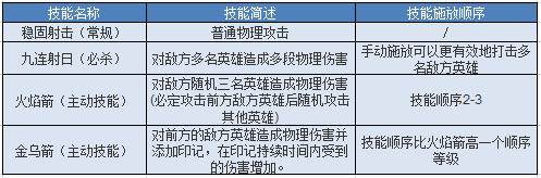 总结:九连射日(必杀)指向性范围技能正确的施放可以更有效的打击多名敌方英雄,造成更多的伤害;火焰箭(主动技能)对敌方随机三名英雄造成物理伤害整体输出会比普通攻击要高,建议把技能带上;金乌箭(主动技能)这是一个神技,让敌方英雄加深伤害,而且伤害非常的可观。