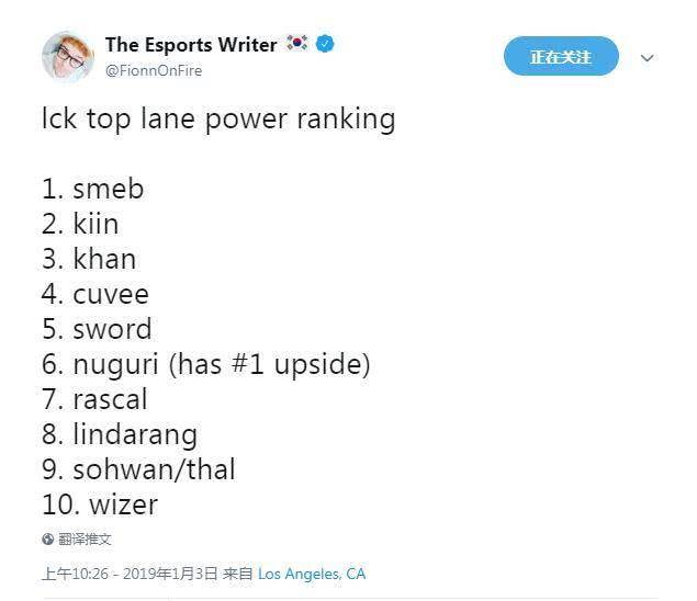 随着近段时间KeSPA杯的落幕,在LCK赛区方面,各大战队也是再一次领略到了这一支新王GRF的恐怖之处了。就在LCK春季赛开赛前夕,ESPN作者Fionn也是在推特上公布了自己新赛季心目中的LCK上单选手的排名情况了。