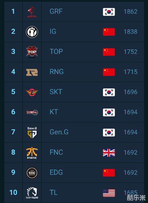 英雄联盟LOL全球战队榜:GRF超越IG成世界第一 SKT重回前五
