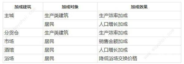 另外上面所述的布局,只是通常情况下的一种布置,玩家还是需要根据自己发展程度和不同的情况来进行调整,毕竟每一个王国的需求还是有所区别的。下面这个表为大家罗列了主要加成建筑的具体效果,玩家可以进行参考,并根据自己的发展阶段进行布局。