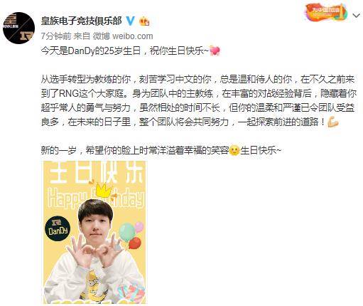 RNG今日早上更新微博,祝福新任主教练DanDy,25岁生日快乐!