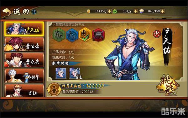 副本中一共有6个人物可以进行挑战,分别是卢天佑、曹玄亮、曹焱兵、姬烟华、吉拉、夏玲。挑战不同人物和不同难度需要达到一定的等级。挑战较高难度的关卡需要先通过前一难度。