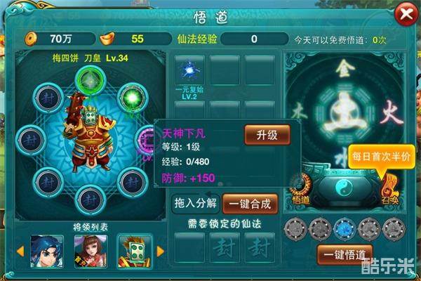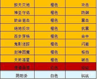 3、蓝色,紫色和橙色仙法可装备玩家角色或将领用以快速提升人物的各个属性,包括攻击、防御、生命、暴击、闪避、命中、格挡、破击、抗暴和怒气。随着仙法颜色依次递增仙法所增加的属性数值越多,也就是说仙法的品质越好。可以通过消耗低品质仙法分解后获得的仙法经验来提升高品质仙法的等级,仙法等级越高,属性越强大。