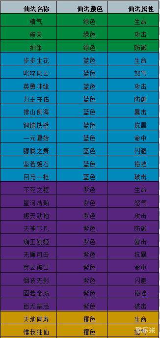 1、仙法对应5种颜色:白色,绿色,蓝色,紫色,橙色和红色。