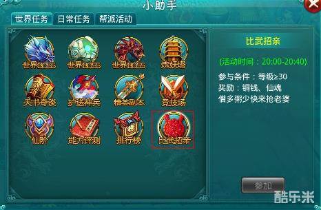 每周一至周四20:00-8:40开启比武招亲活动,玩家等级需达到30级,点击右上角小助手,打开界面即可看到比武招亲按钮,点击参加即可进入活动场景。
