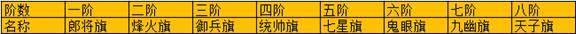 旌旗主要的作用是给玩家加成伤害、稳定、生命值,法力值等属性。旌旗分为郎将旗、烽火旗、御兵旗、统帅旗、七星旗、鬼眼旗、九幽旗、天子旗八种。
