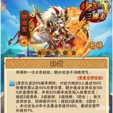 同时,孙武还拥有强力的怒气必杀,可对敌方随机武将造成高额的元素伤害、物理伤害与直接伤害,并有极大概率使其陷入晕眩状态,该大招必命中必暴击,且有大概率连续释放,多重伤害与控制可帮助少年强势逆转战局,奠定优势地位。