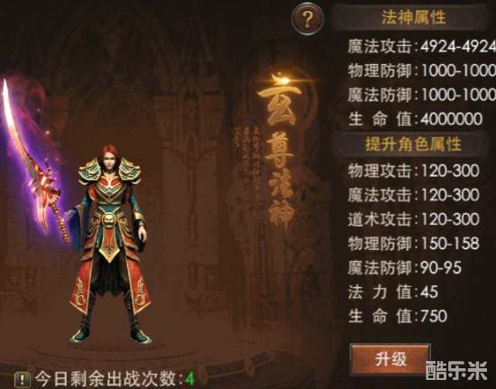 玄尊法神是玩家第个5可激活法神,连续登陆30日可获得(建议玩家可以配合开服活动激活);玄尊法神属于可升级法神(等级上限50级),每日出战次数4次