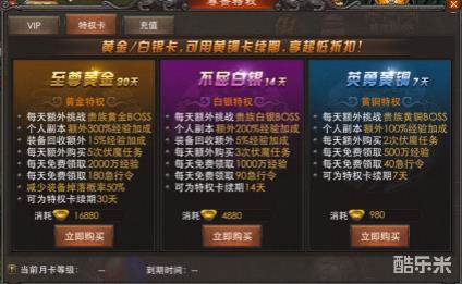 1、黄金卡:消耗16880元宝购买30日(首次开卡只需消耗12880元宝即可获得)