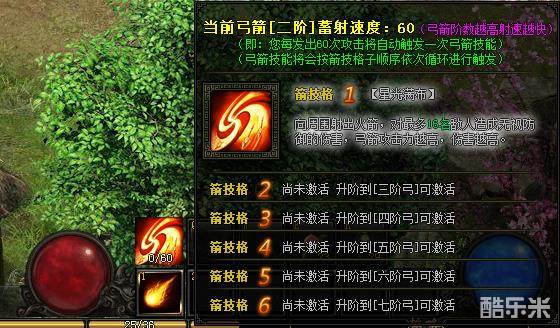 玩家学习到弓箭技能后,技能栏左侧将显示出弓箭技能图标,可以查看弓箭技能和蓄射速度,蓄射时间时间到了将自动轮流触发弓箭技能。弓箭等阶越高,弓箭技能越多,则技能触发频率越高。